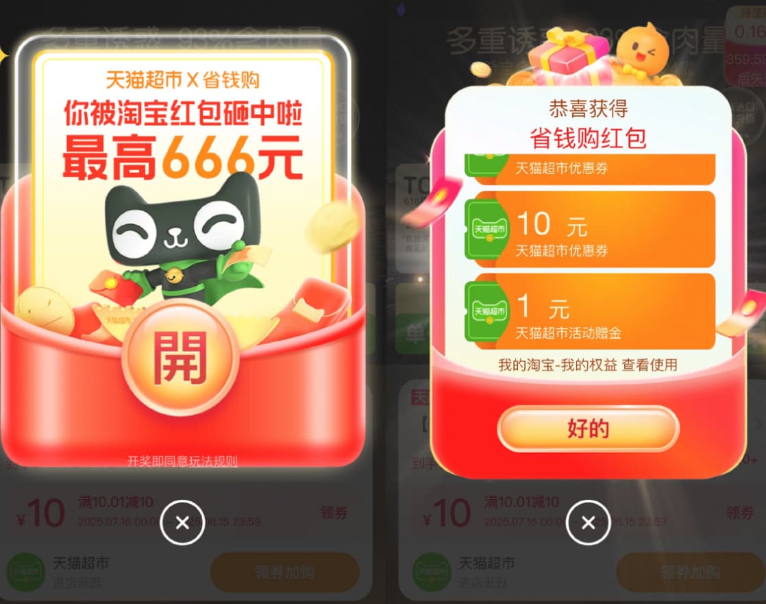 淘宝打开活动->每天签到领随机红包和天猫超市卡