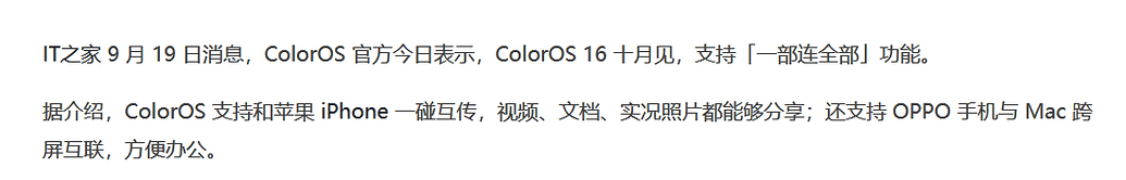 oppo 确认 10 月发布ColorOS 16 :支持 iPhone 一碰互传、OPPO 手机与苹果 Mac 跨屏互联