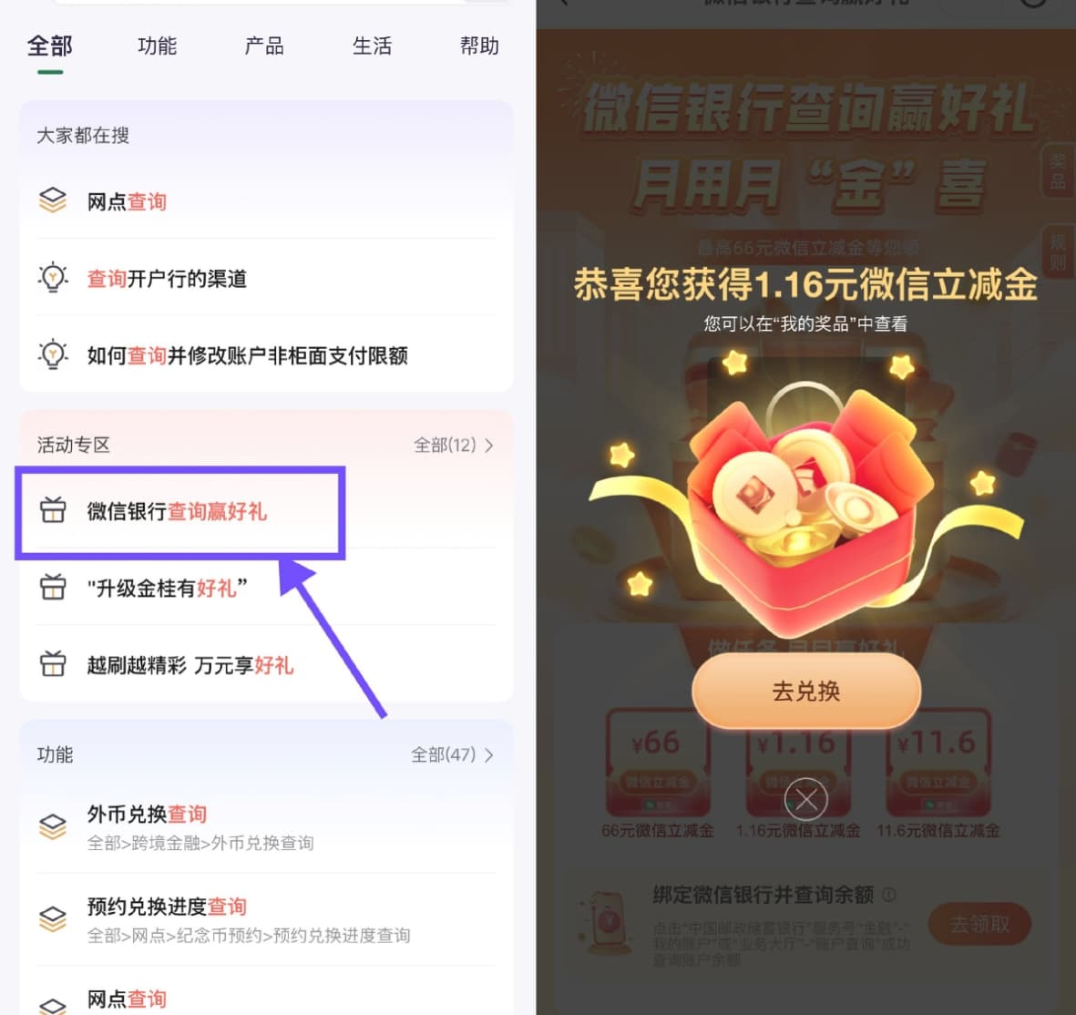 邮储APP搜索“查询赢好礼”->根据提示去查看->返回页面抽1.16~66元立减金
