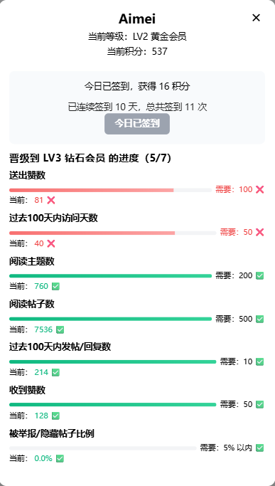 - 由于签到功能的引入,以及论坛积分的缓存机制,可能存在原先脚本获取到的积分与签到里的积分不一致,现修改脚本中的积分获取来源为签到模块中的积分。