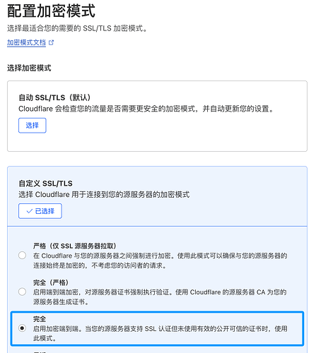 如果你使用的是上文自建证书,请确保此处的加密模式使用的是完全 / FULL