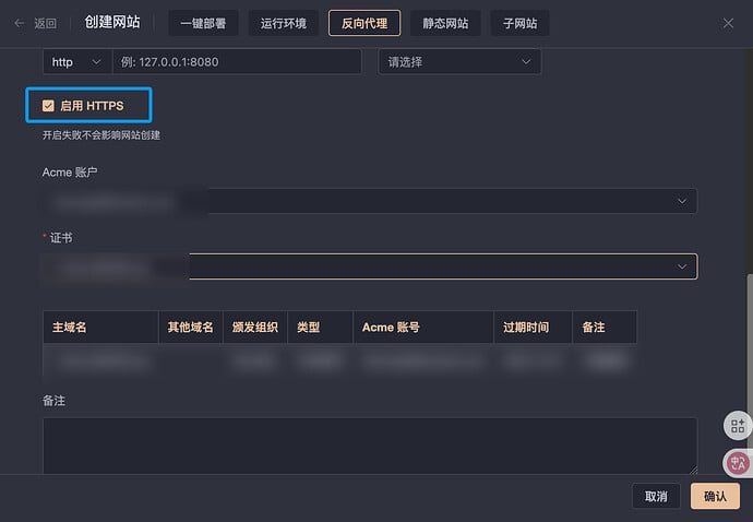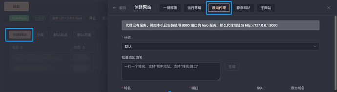 前往网站选项卡,点击创建网站,在弹出界面的上部选择反向代理,并填写好需要监听的域名