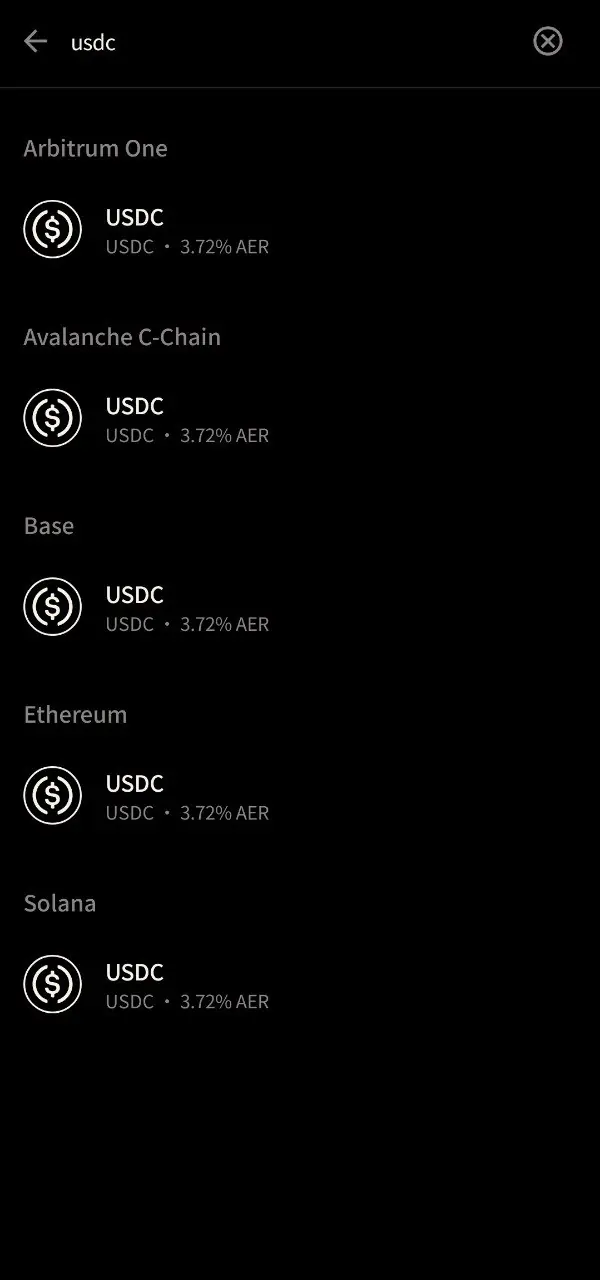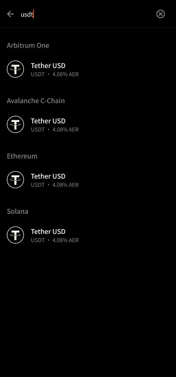 如果你想使用USDT或者USDC入金,请注意它支持的链,目前USDT支持Arbitrum One/AVAXC/ETH/Solana,USDC会多一个Base