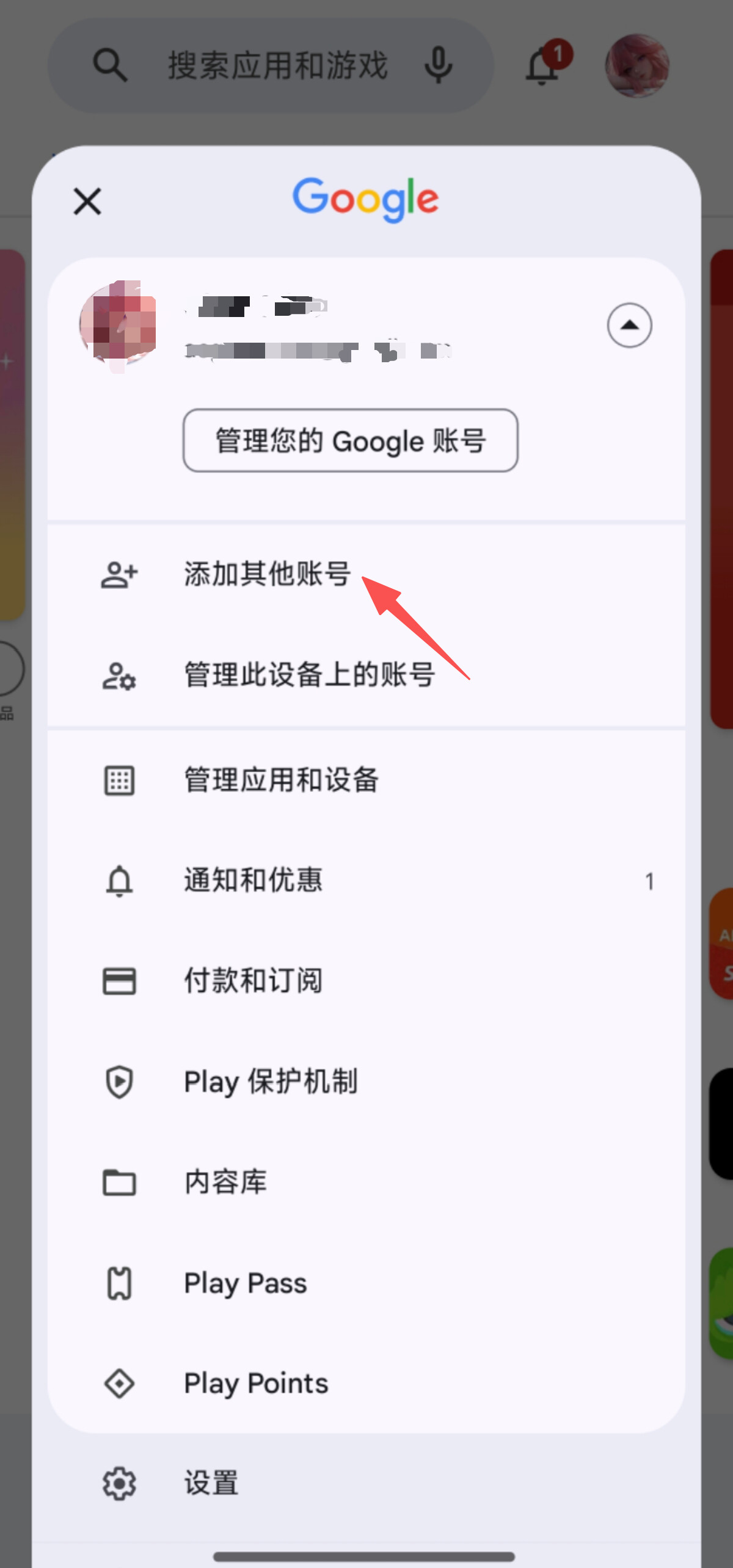 1、打开Google play 商店,选择右上角的账号图标,再选择添加其他账号