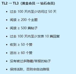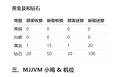 黄金会员升级钻石,新规则要求是收50赞送100赞,但在社区权限对照表中要求收50以赞上,送60赞以上,建议修改,也建议将权限对照表和社区规则合并,方便查阅。