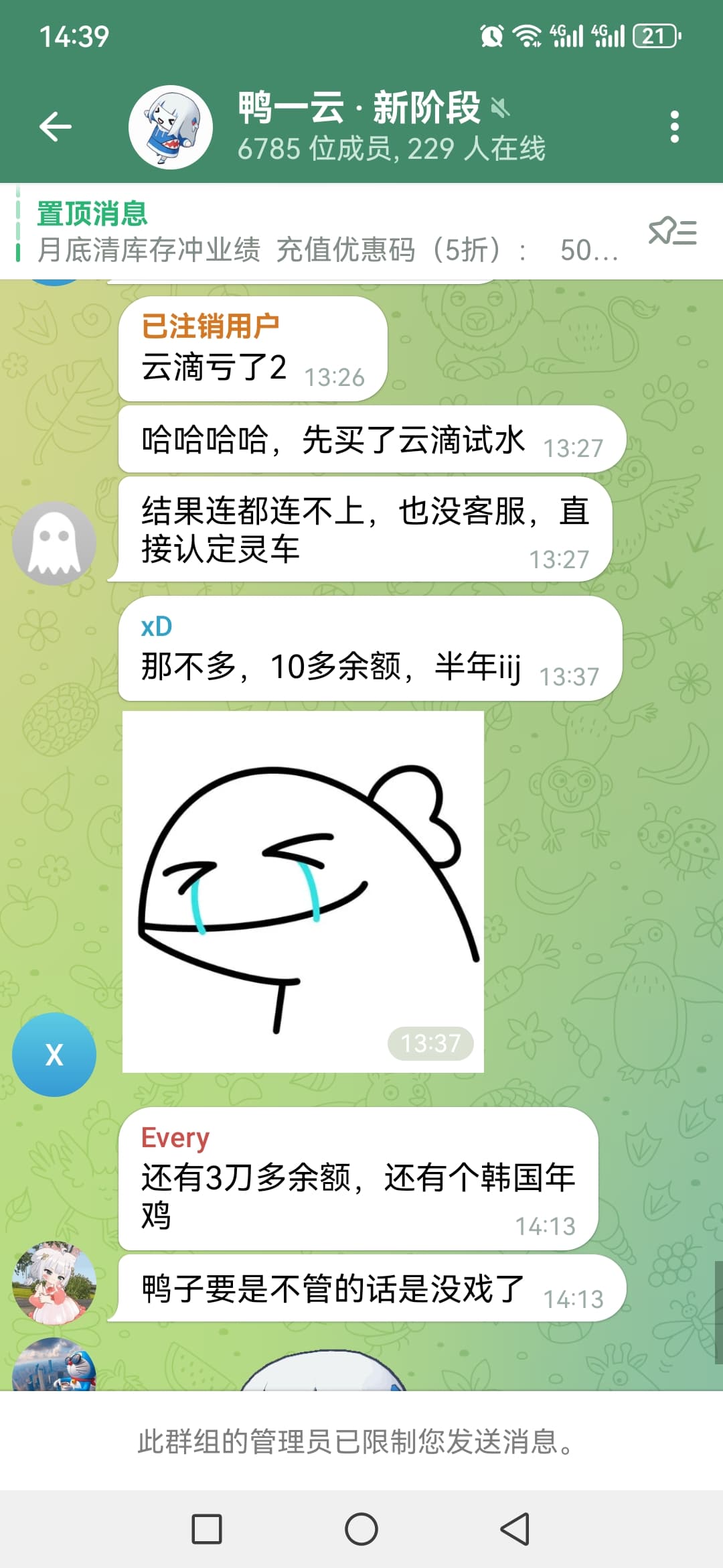 鸭子云一片哀嚎,不能说他半点不好。说他IP被墙都要被一群管理限制发言,群里怎么还会有6000多人,真是奇葩现象。希望各位不要充值,切记切记,我几U在里面,当做喂狗。