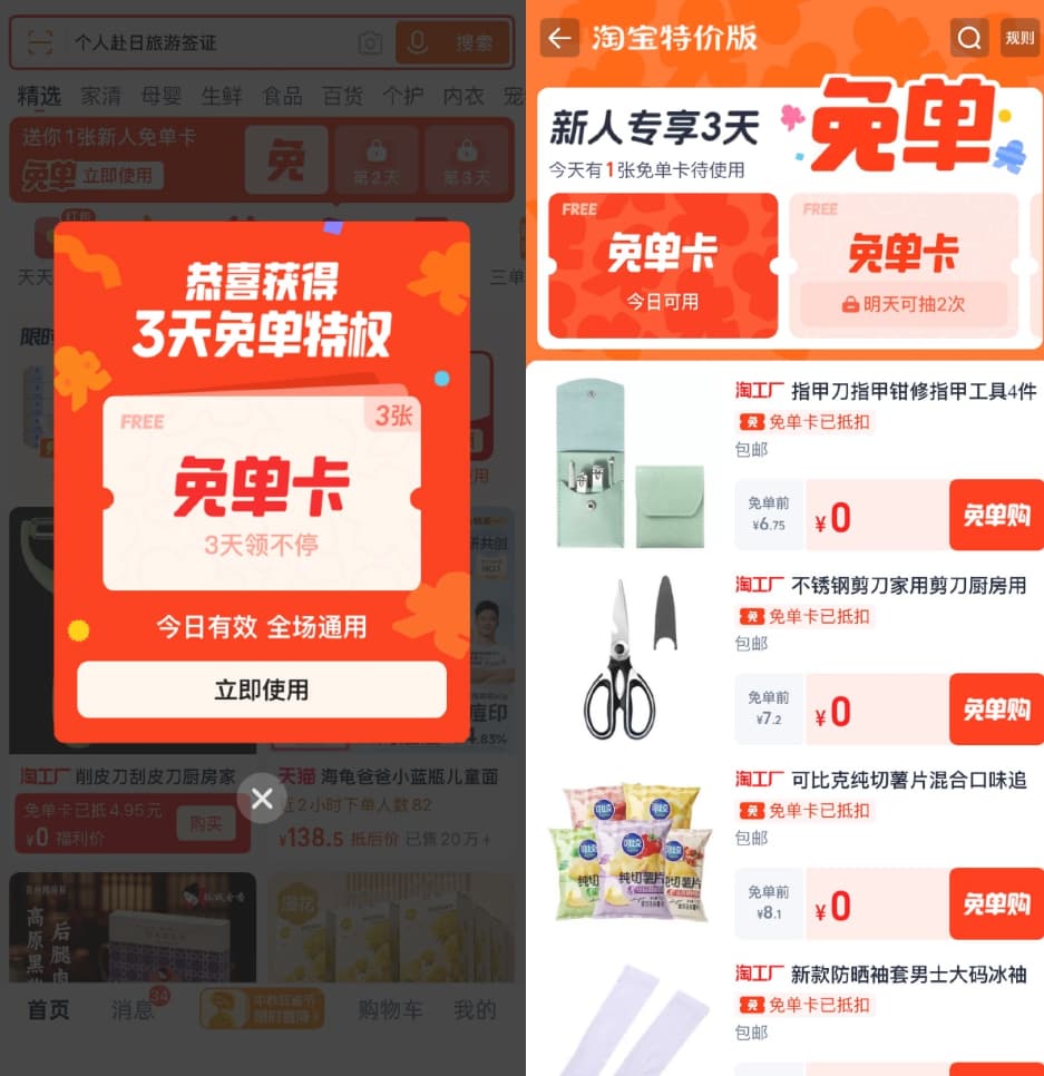 淘宝特价版登录领3天免单卡