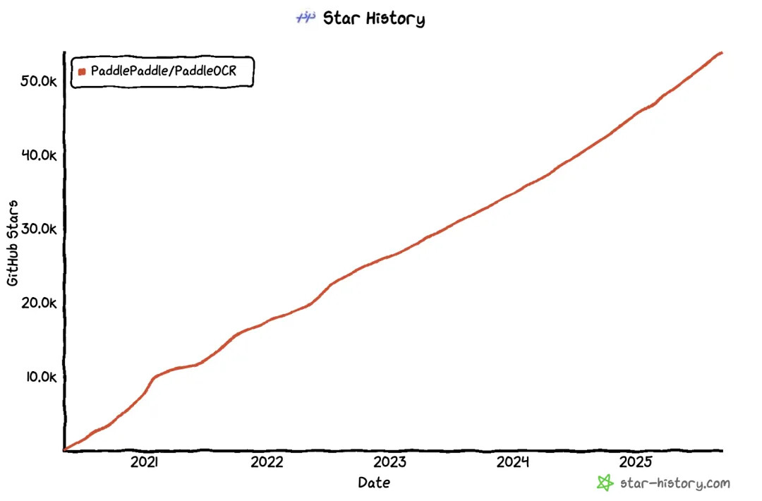 从2020年开源至今,PaddleOCR一路高歌猛进,GitHub Star数一路飙升,先后突破了10k、20k、30k,一直到达今天惊人的 55k+ star,从一个高效的OCR工具,一步步成长为一个覆盖多种场景、支持多语言、模型轻量且性能强劲的开源项目,背后是团队持续的创新和社区的大力支持。