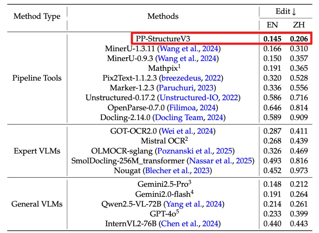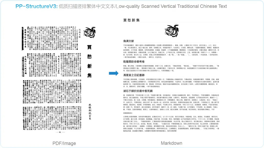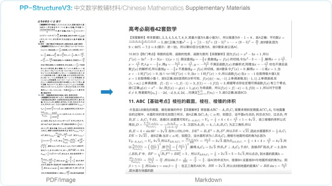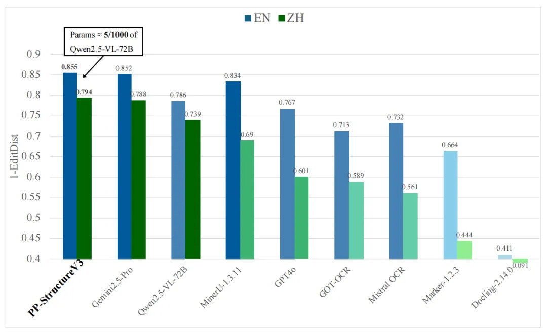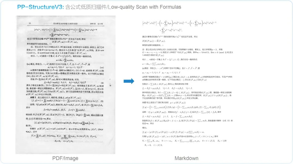 PP-StructureV3 依托 PaddleOCR 强大的多模态解析能力——涵盖版面检测、文本识别、表格重构、公式提取、图表解析与智能页面排序——一举实现从复杂版式图像到清晰结构化 Markdown 的高精度转化,并在 OmniDocBench 数据集上表现优异,效果领先于现有的一众 pipeline 方案与多模态大模型方案。该能力显著加速高质量企业级知识库的构建进程,为大规模模型训练与应用提供坚实可靠的语料基础。