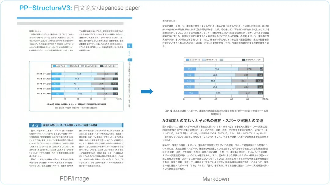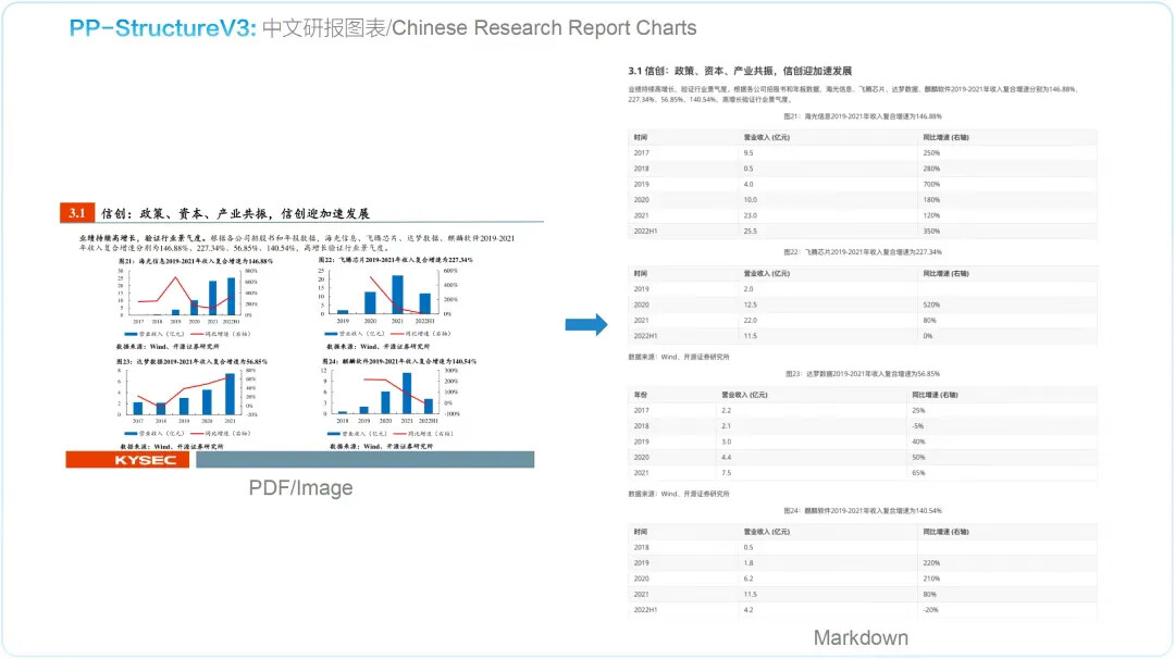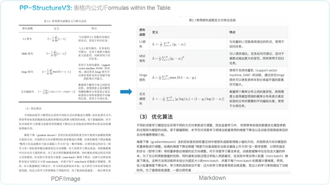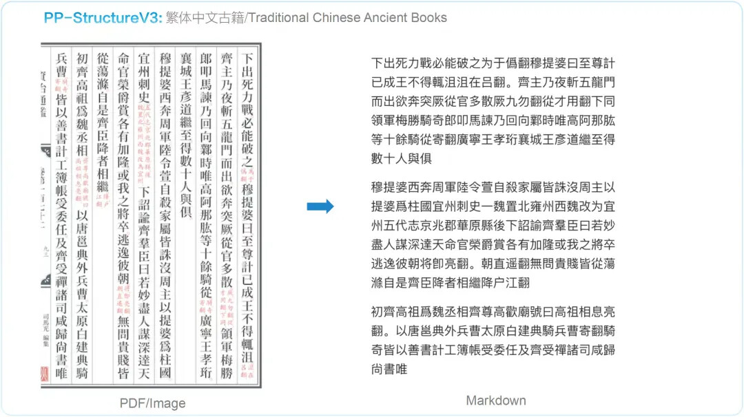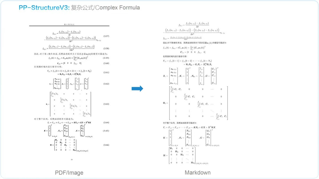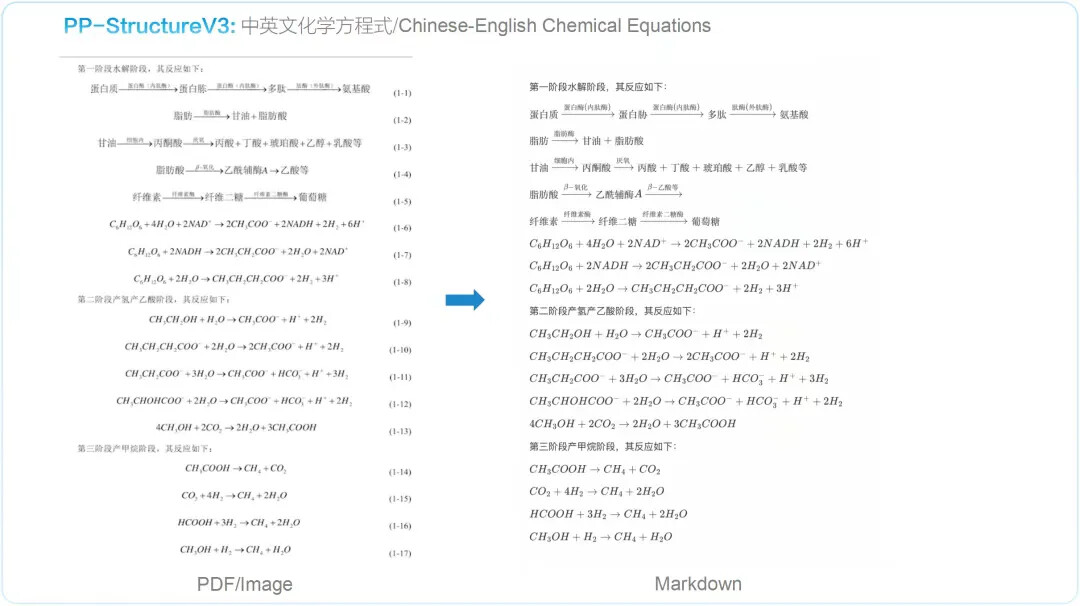 PP-StructureV3 依托 PaddleOCR 强大的多模态解析能力——涵盖版面检测、文本识别、表格重构、公式提取、图表解析与智能页面排序——一举实现从复杂版式图像到清晰结构化 Markdown 的高精度转化,并在 OmniDocBench 数据集上表现优异,效果领先于现有的一众 pipeline 方案与多模态大模型方案。该能力显著加速高质量企业级知识库的构建进程,为大规模模型训练与应用提供坚实可靠的语料基础。