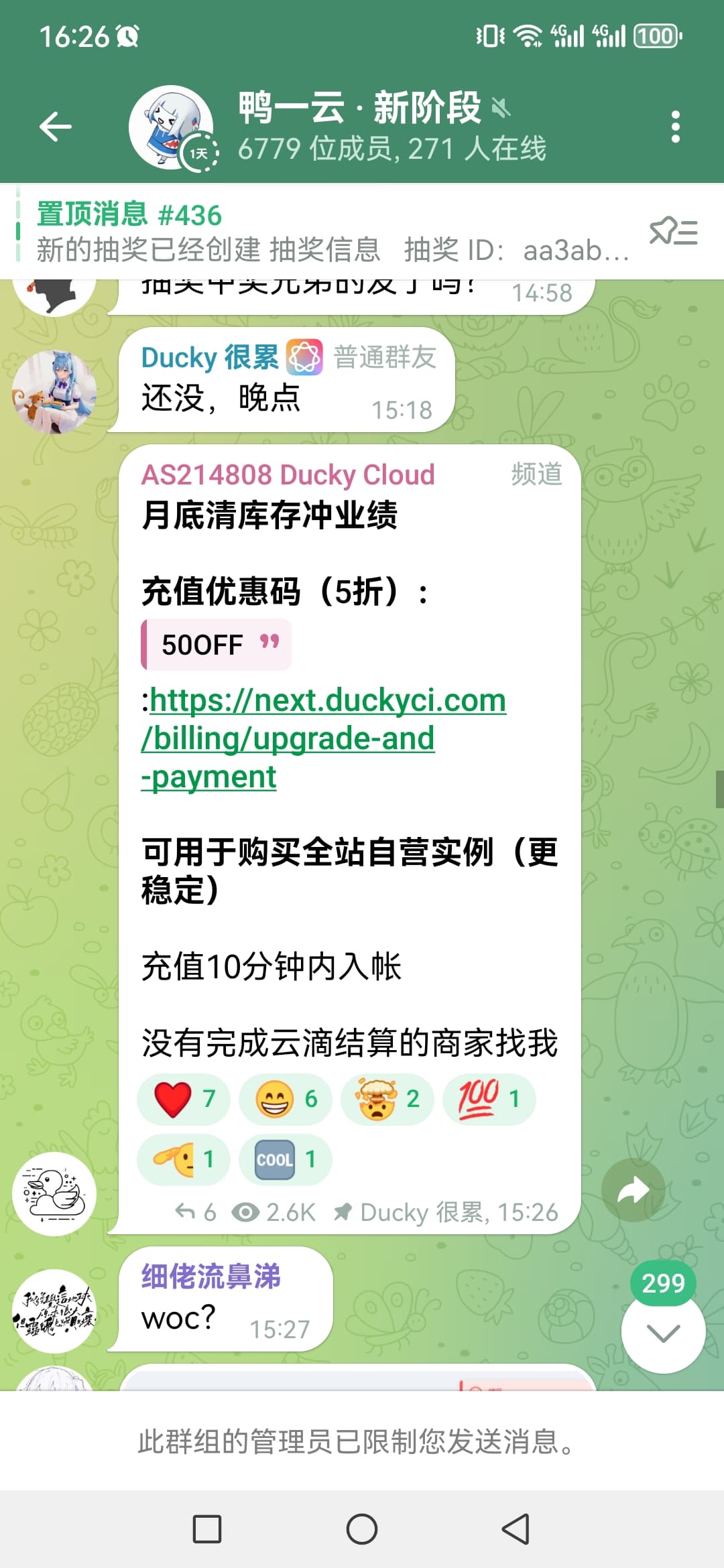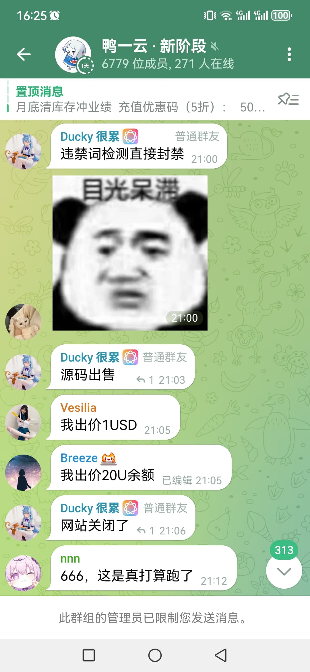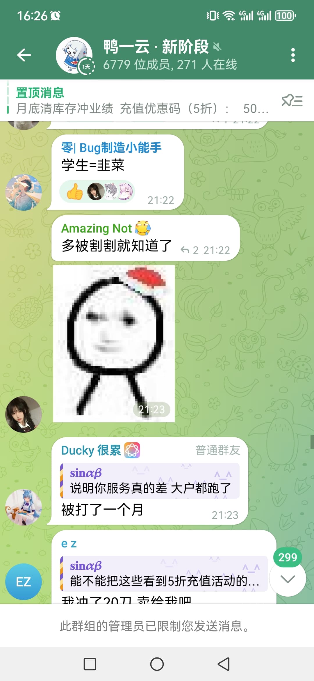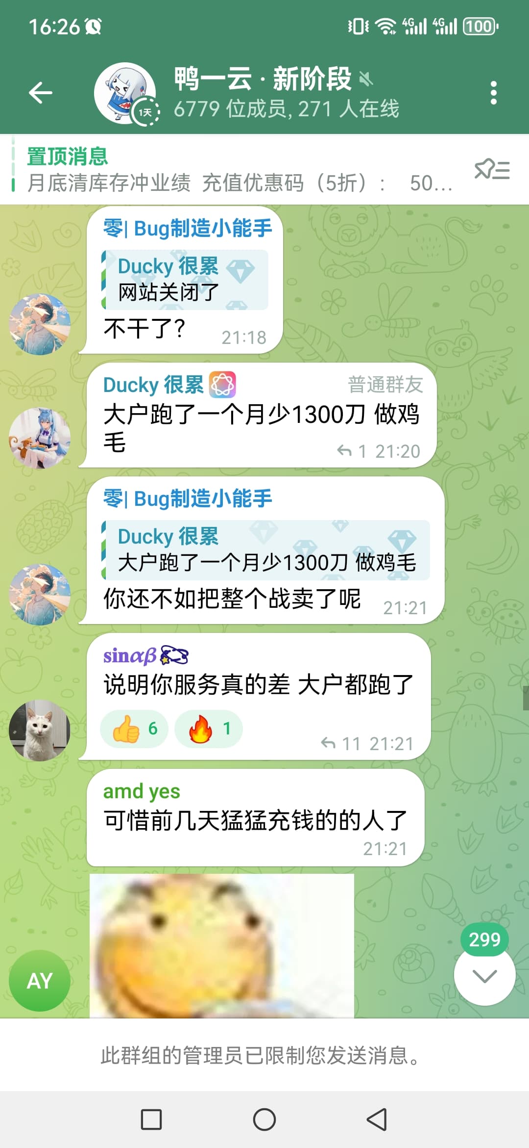 之前就有群友反应买鸡第二天就挂,各种无售后,无退款,群里管理就禁言,管理还在群里说群主,学习忙,大家不要急,现在官网都炸了,多少人是看着五折活动充值购机的,这一波韭菜割的厉害。常规现象突然大规模优惠活动就是割韭菜跑路的节奏。既然还有大户前前后后充值了1300刀。