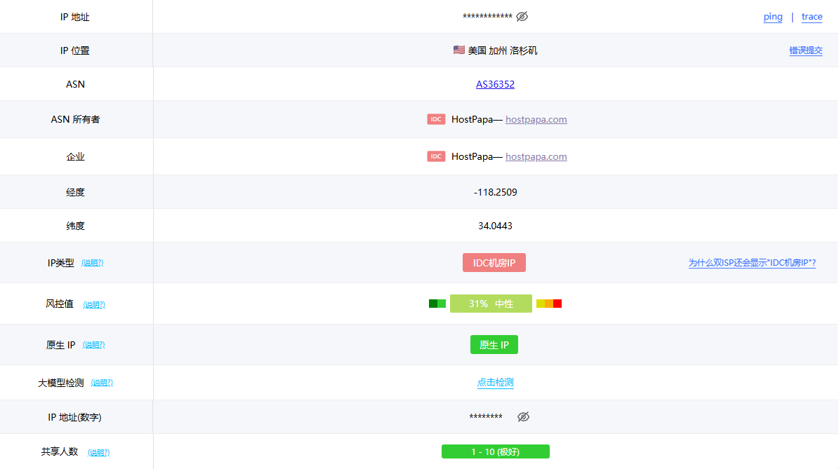 大佬们,你们觉得这个IP质量如何,然后怎么知道这个IP是不是洛杉矶DC2机房的IP,上面只显示了这是IDC机房的原生IP