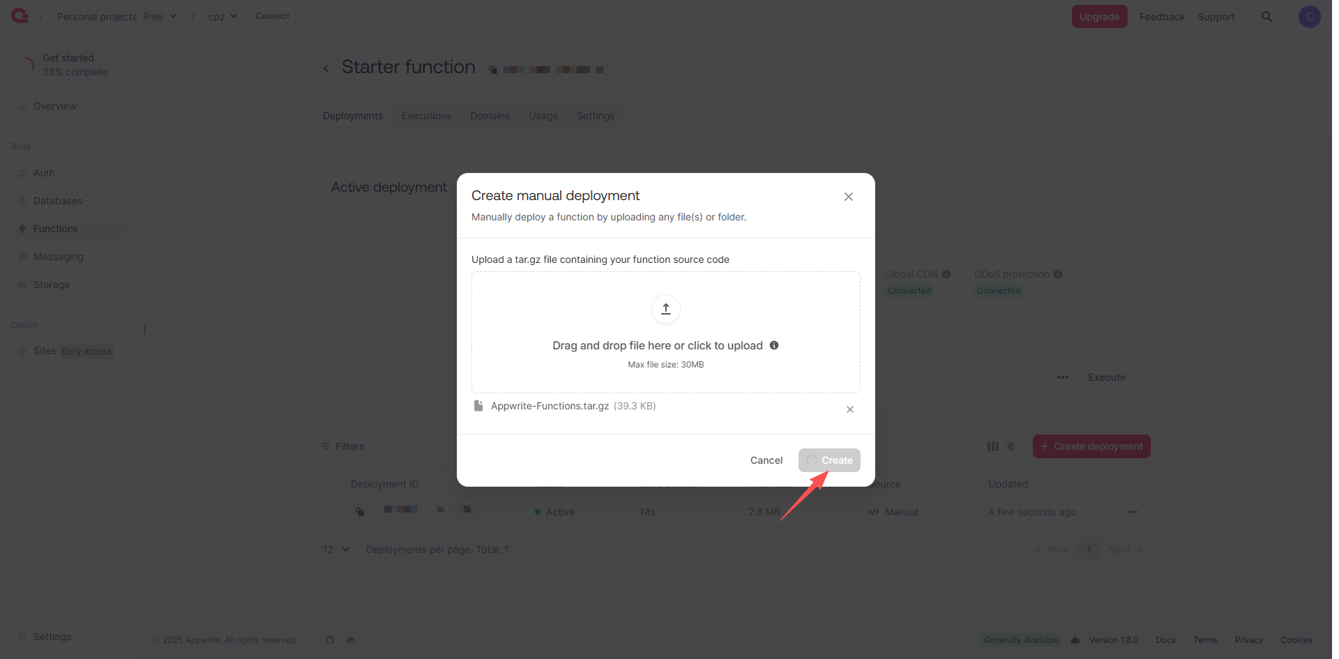 7、上传老王编译好的程序压缩包,点击create创建