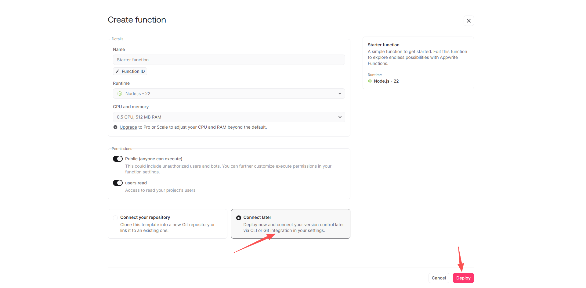 5、名字随便取,其他的保持默认就好,然后最下面选择Connect later,然后点击Deploy