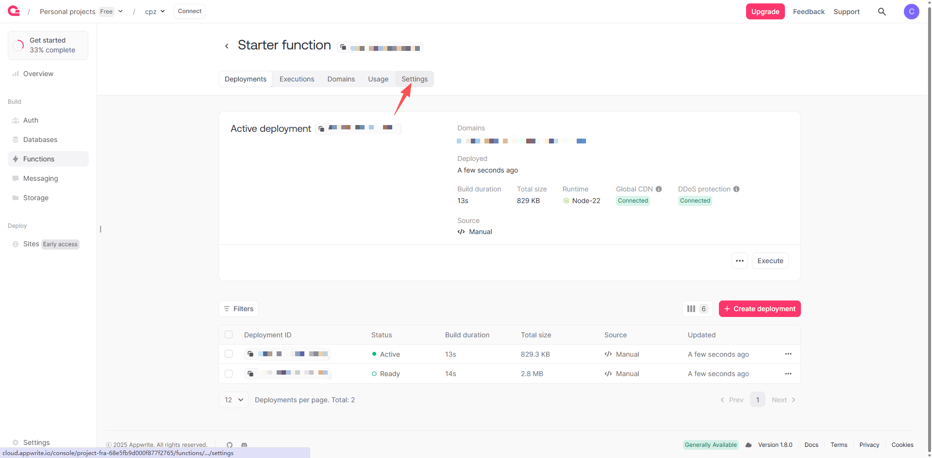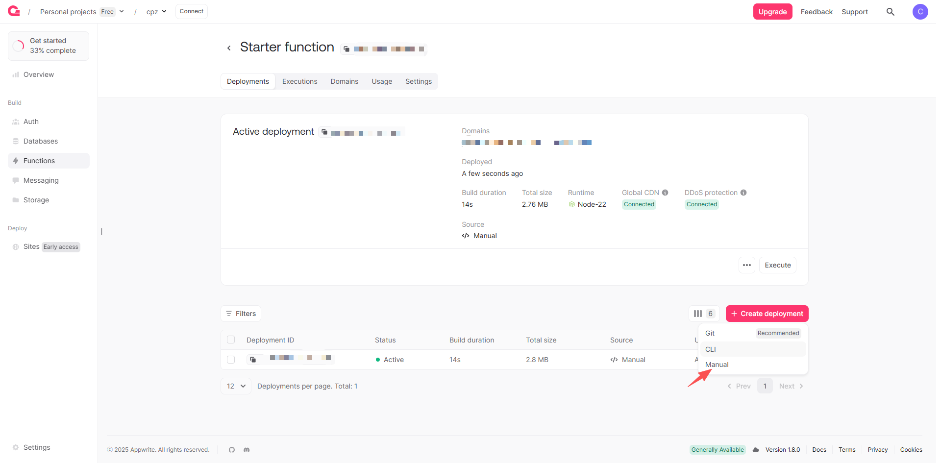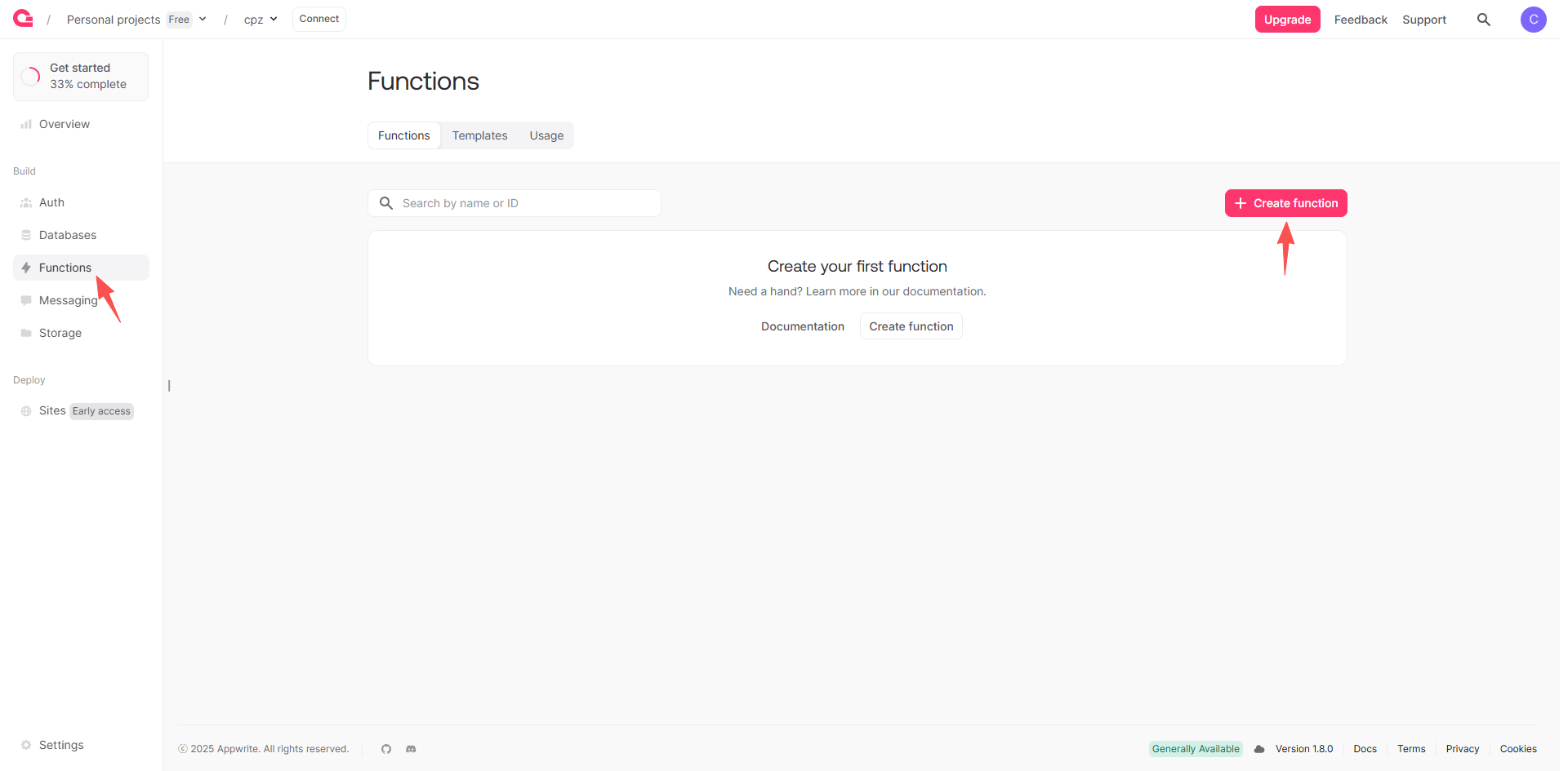 3、项目创建好后选择Functions进入项目主页,然后选择 create function创建项目