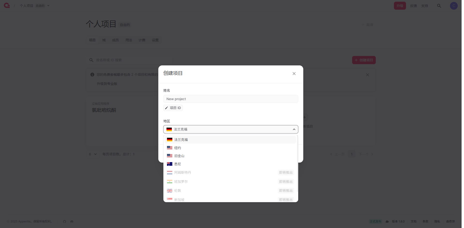 2、账号注册好后提示你要先创建自己的项目,项目名字可以随便取,然后选择一个节点区域,目前只有(法兰克福、纽约、旧金山、悉尼)这四个地区节点可选,其他区域后续会陆续推出,我选择的是德国,可以根据自己的运营商来选择