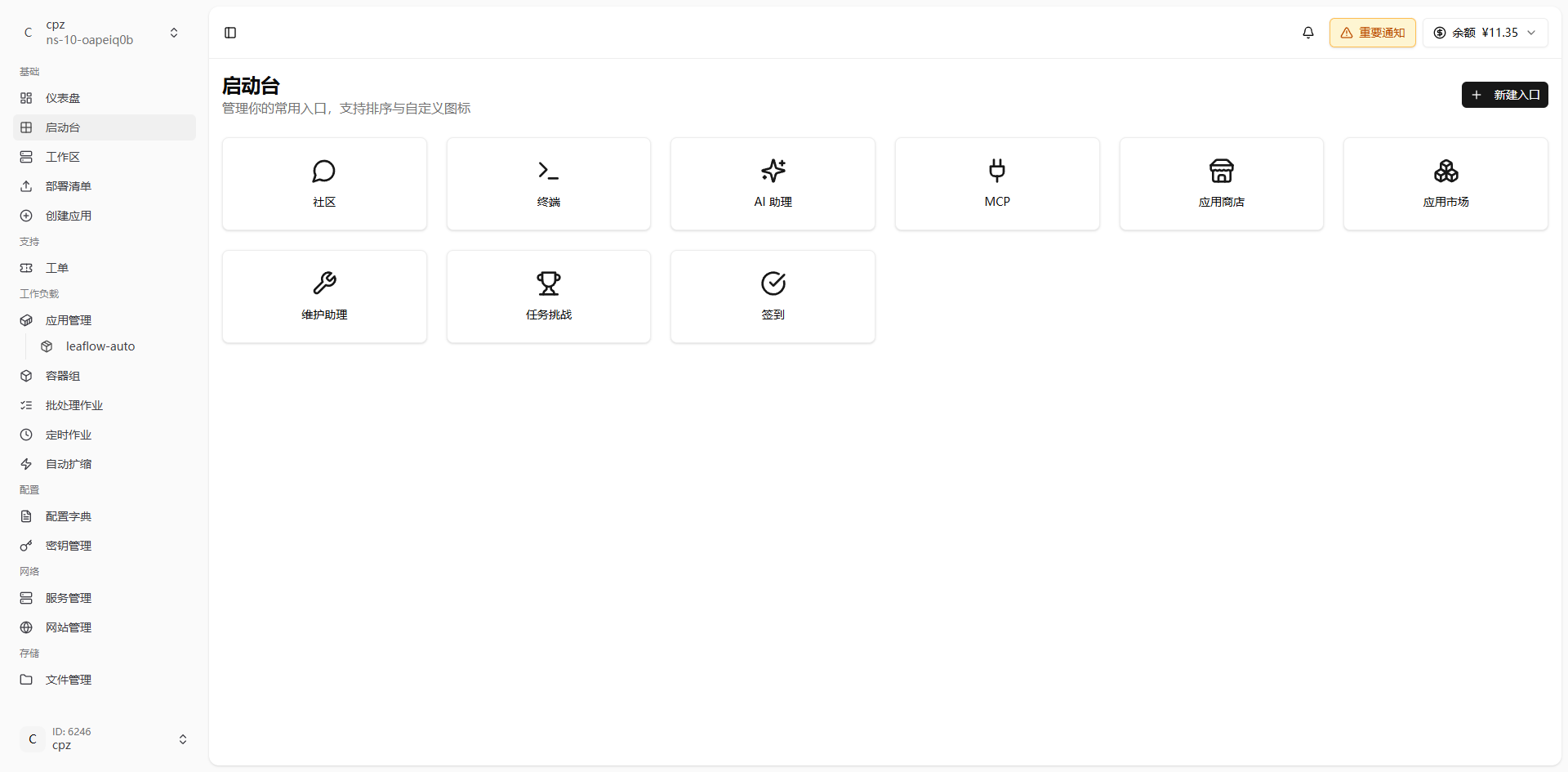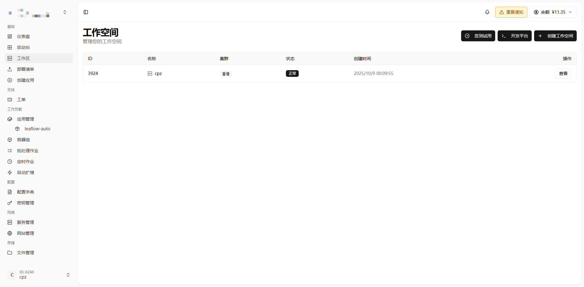 今天来看一个类似于爪云的容器化部署平台Leaflow,好像是前两个月刚出来的,还不是很火,我昨天去弄了一个 官网在这儿 https://leaflow.net/ ,注册之后进入主界面,创建工作空间,选择集群,暂时有3个区域可选(深圳、十堰、香港),我昨天选了个香港的,还不知道用来干啥,现在正在测试阶段,免费使用,无限流量的,目前可以知道的是能拿来部署WordPress 博客网站,还可以部署AI类的程序,不知道可不可以用来搭其他的服务,现在可以签到试用,大佬们感兴趣的话可以去研究研究 ![]()