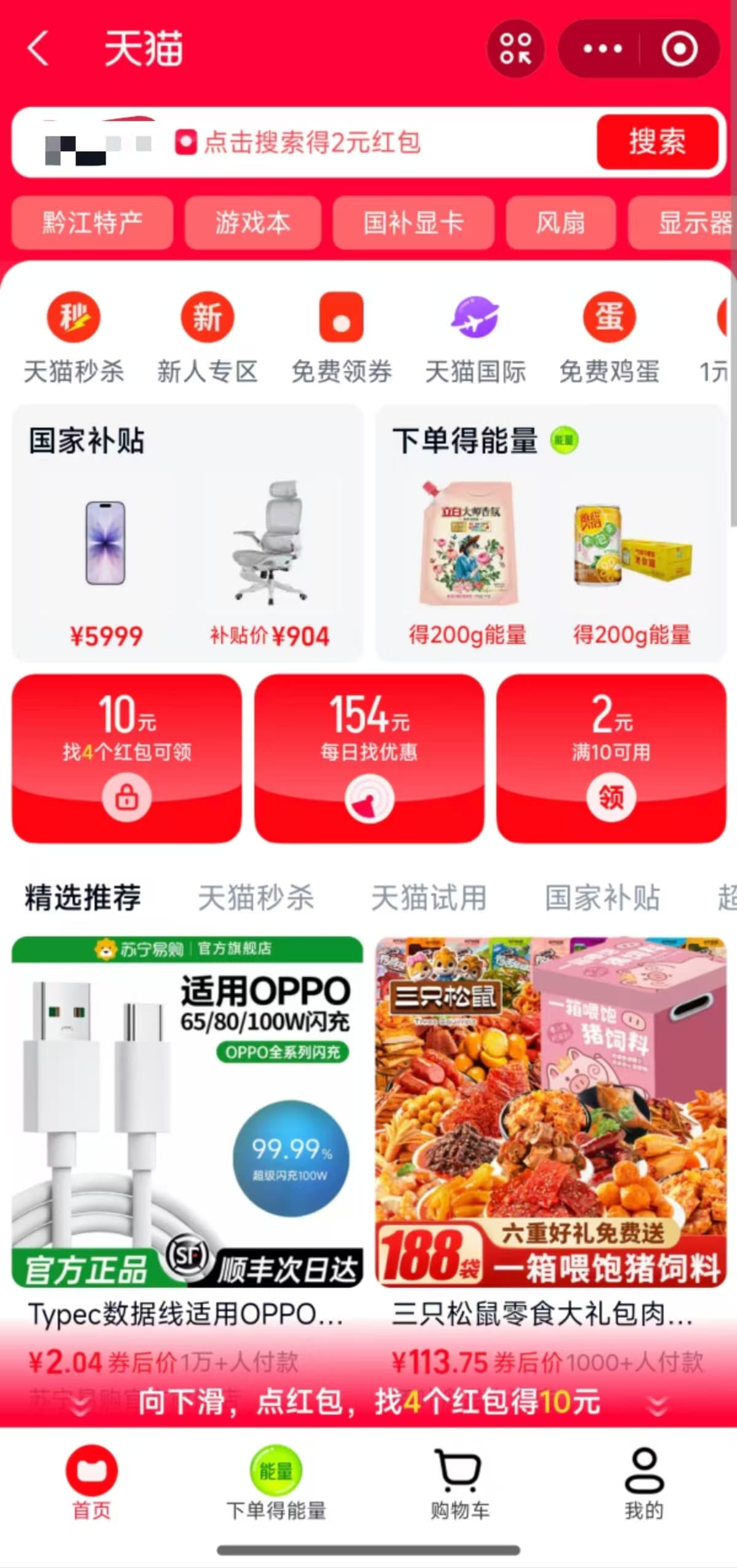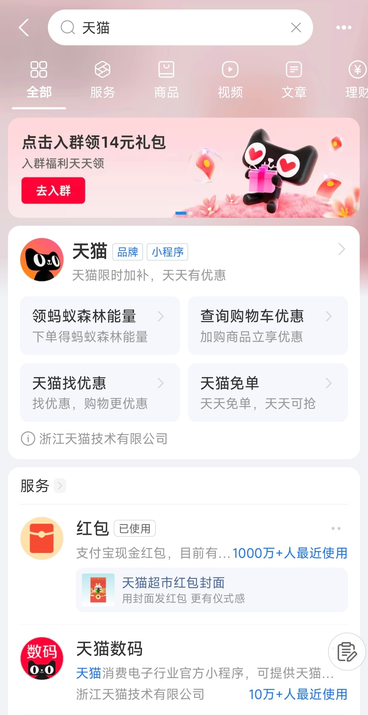 点击进入支付宝主页,搜天猫,下滑找寻店铺,领取10元红包
