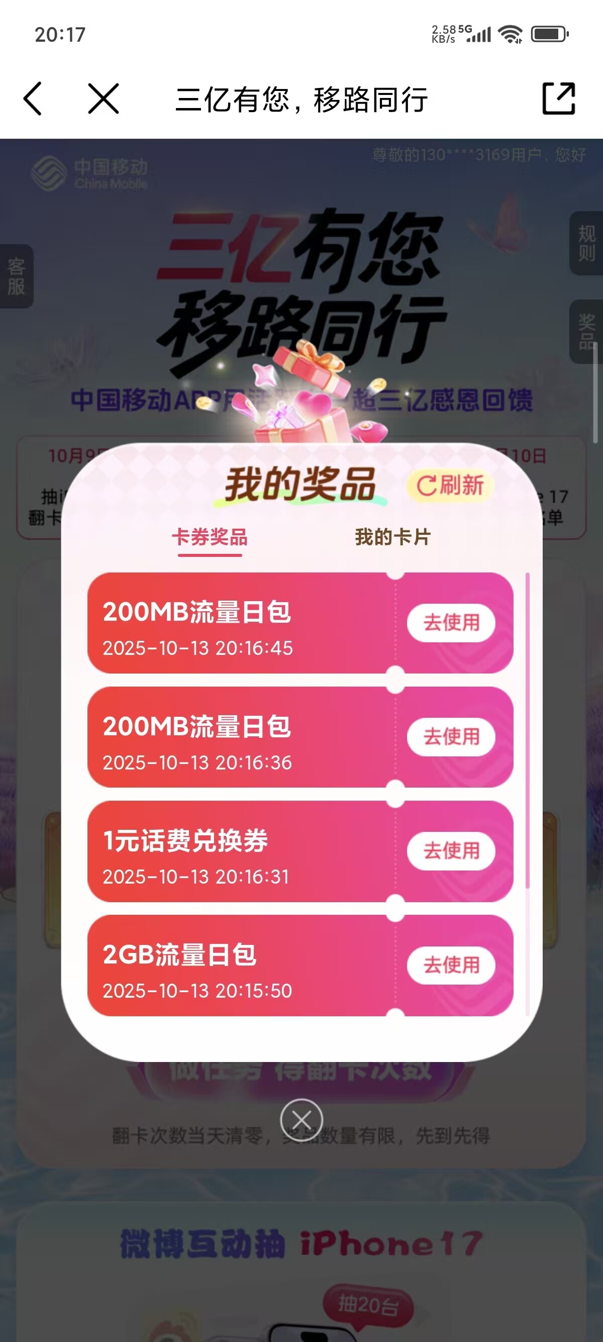 移动APP搜索“三亿有您”->简单流量得次数翻牌,抽1~666话费兑换券或加赠券、2GB流量券等奖励