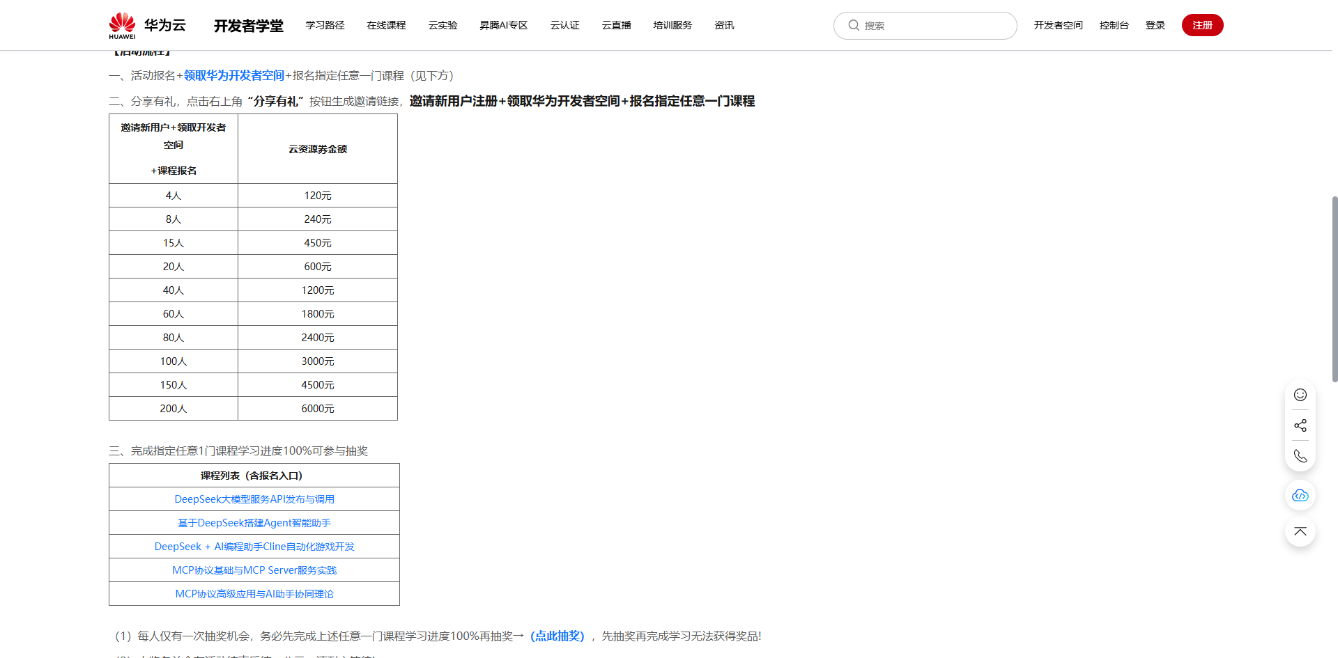 5、成功邀请40个新用户注册+领取华为开发者空间+报名指定任意一门课程可得1200元云资源券