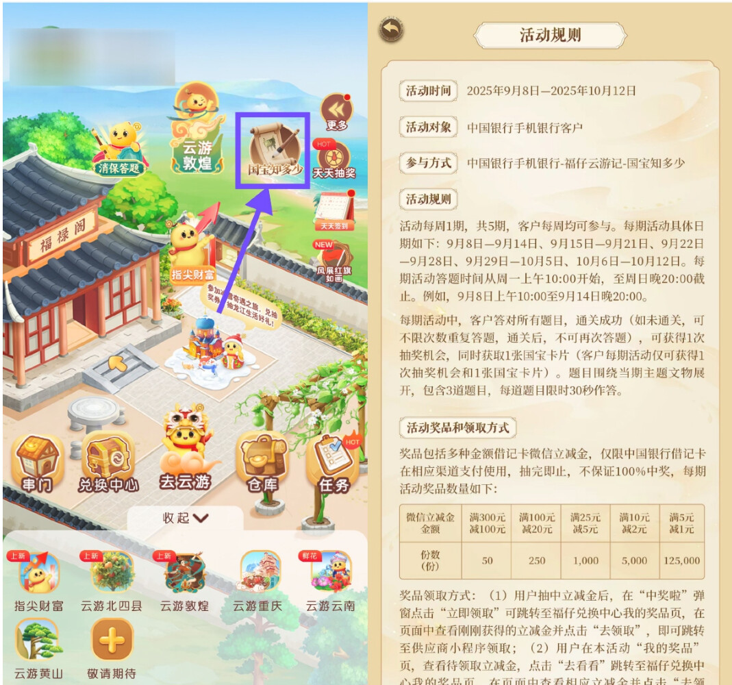 中行APP搜索“福仔云游记”->国宝知多少->全部答对抽1~100立减