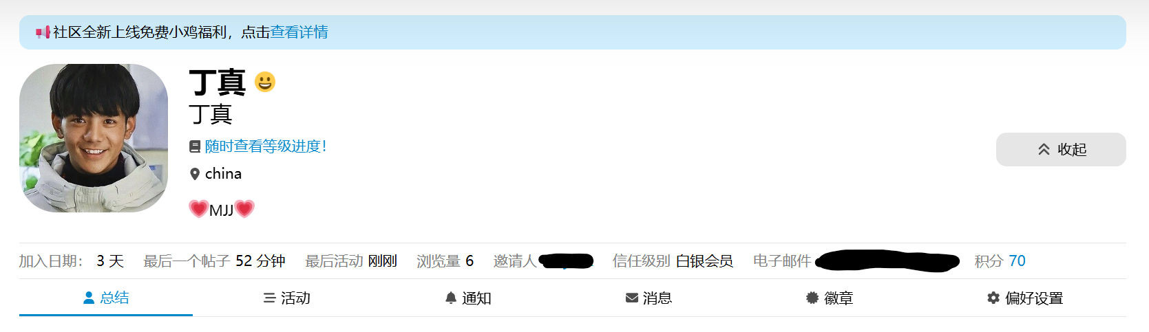 在头像-个人资料-总结-展开后就能看到当前信任级别和邮箱 MJJBOX 和 MJJVM站使用的邮箱一定要相同,提工单验证等级