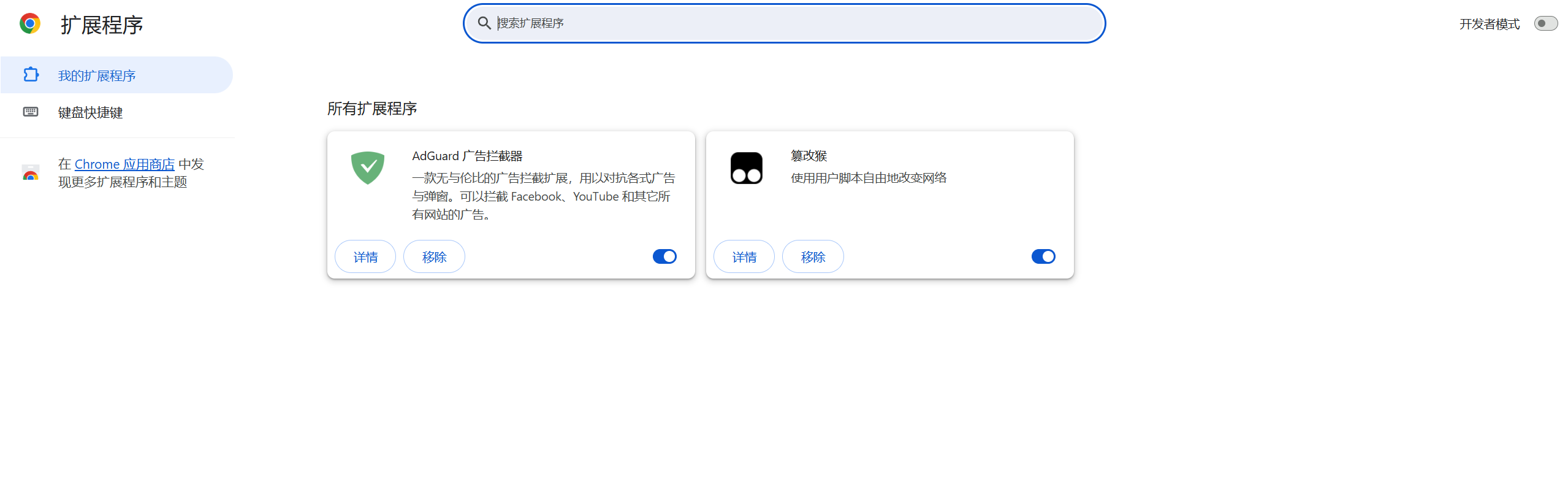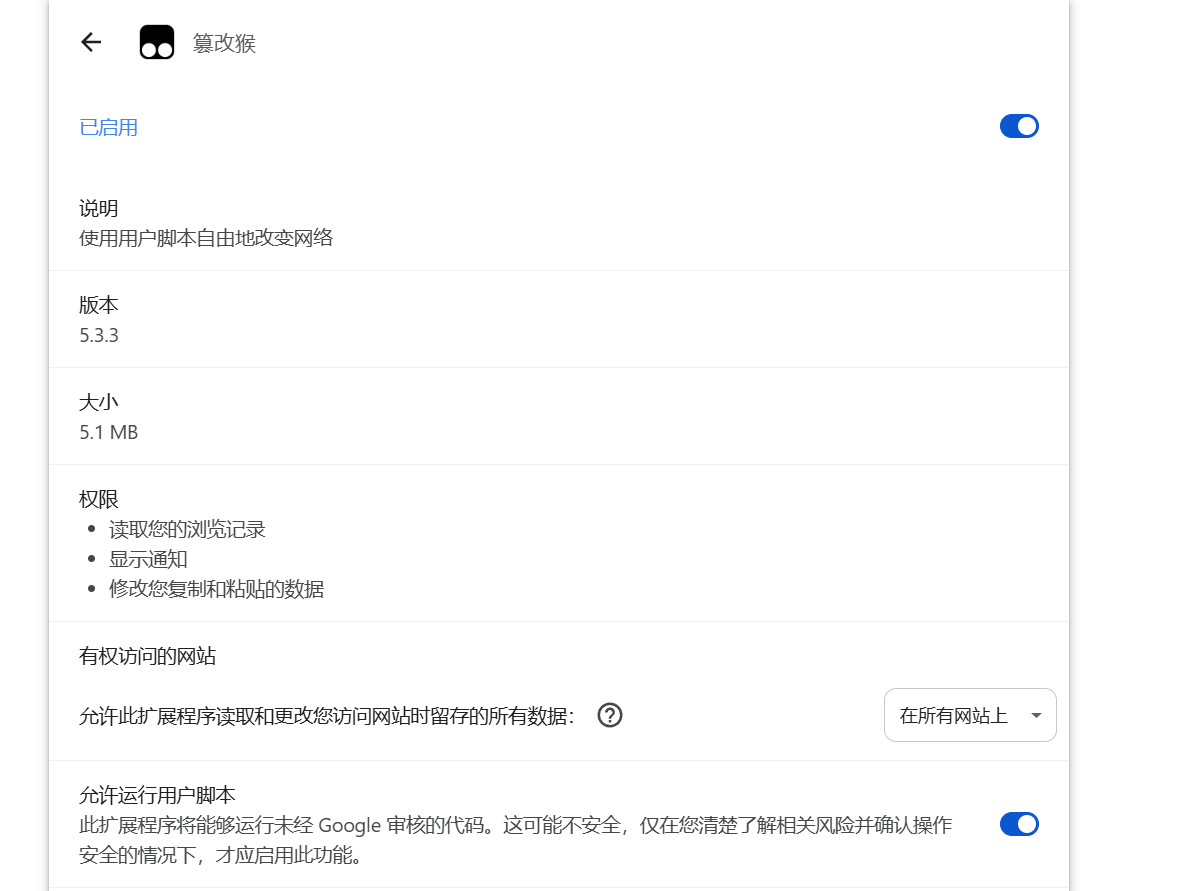 1、点击浏览器右上角三个点,点扩展程序,管理扩展程序,点击油猴的详情,进去之后找到允许运行用户脚本,点击打开即可: