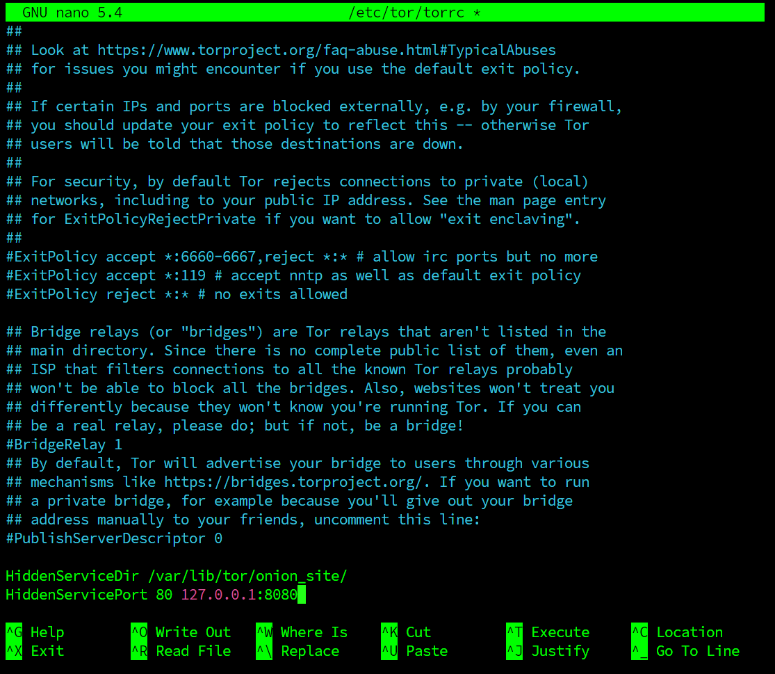 HiddenServicePort 80 127.0.0.1:8080